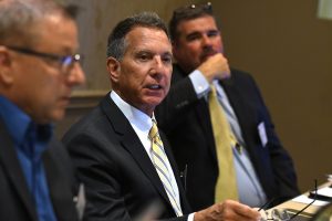 Commissioners Philip Harris III, Work-Based Education Coordinator, Berks Career & Technology Center (left), Frank Preston, President and Director of Education, ACI Medical and Dental School (center), and Frank Whelan, President, ASI Career Institute (right), review school accreditation applications.