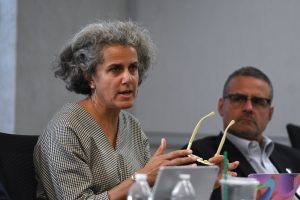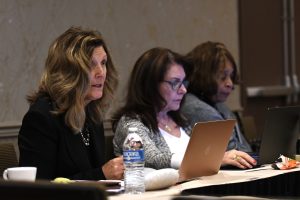 Middle States Associate Vice President Priscilla Feir ( left), Commissioner Peggy Pelonis, President, American Community Schools, and Commissioner Jennifer Beckwith Founding Director, American United School of Kuwait (right), deliberate on school accreditations.